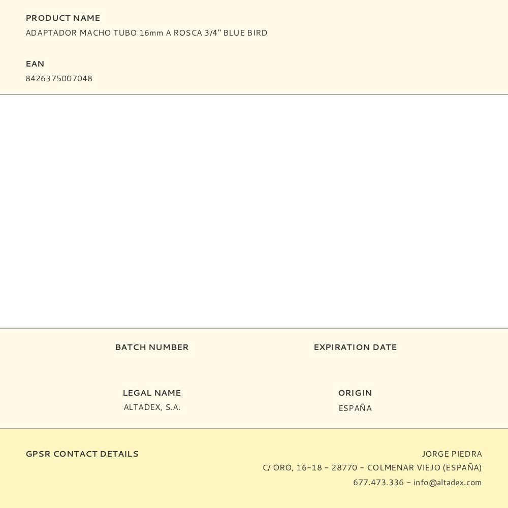 ADAPTADOR MACHO TUBO 16mm A ROSCA 3/4″ BLUE BIRD | Repuesto de calidad, compatible y fácil de instalar
