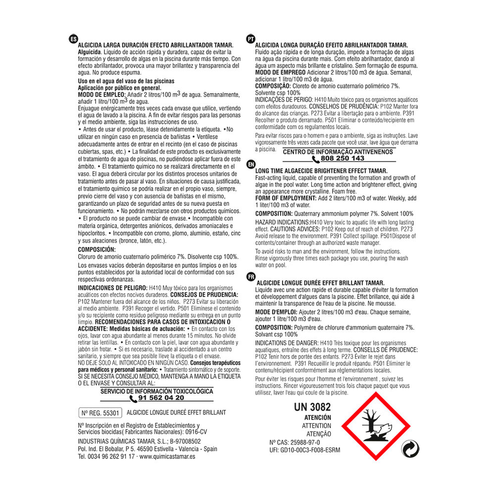 LÍQUIDO DE ACCIÓN RÁPIDA Y DURADERA, CAPAZ DE EVITAR LA FORMACIÓN Y DESARROLLO DE ALGAS EN LA PISCINA DURANTE MÁS TIEMPO. «UTILICE LOS BIOCIDAS DE FORMA SEGURA, LEA SIEMPRE LA ETIQUETA Y LA INFORMACIÓN SOBRE EL BIOCIDA ANTES DE USARLO». Repuesto original de alta calidad, ideal para sustitución y mantenimiento. Compatible con instalaciones domésticas y profesionales. Producto duradero, fácil de instalar y optimizado para un rendimiento seguro.