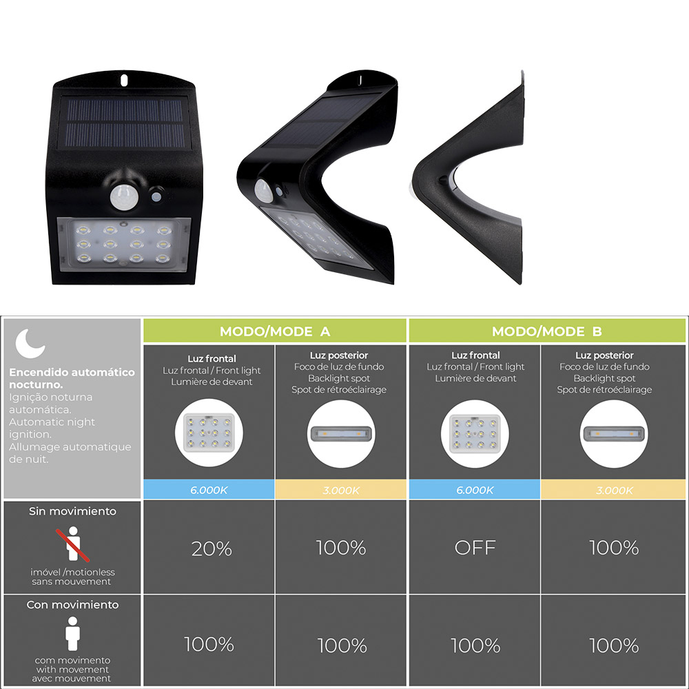 APLIQUE SOLAR 1,5W 220lm RECARGABLE. TIEMPO RECARGA 5-6h SENSOR DE PRESENCIA (2-6m) DOBLE ILUMINACION: FRONTAL 6000K (APERTURA 120°) TRASERA 3000K USO INTERIOR/EXTERIOR IP65 COLOR NEGRO EDM DURACION APROX. 24h MEDIDA: 9,6×7,3x14cm. Repuesto original de alta calidad, ideal para sustitución y mantenimiento. Compatible con instalaciones domésticas y profesionales. Producto duradero, fácil de instalar y optimizado para un rendimiento seguro.