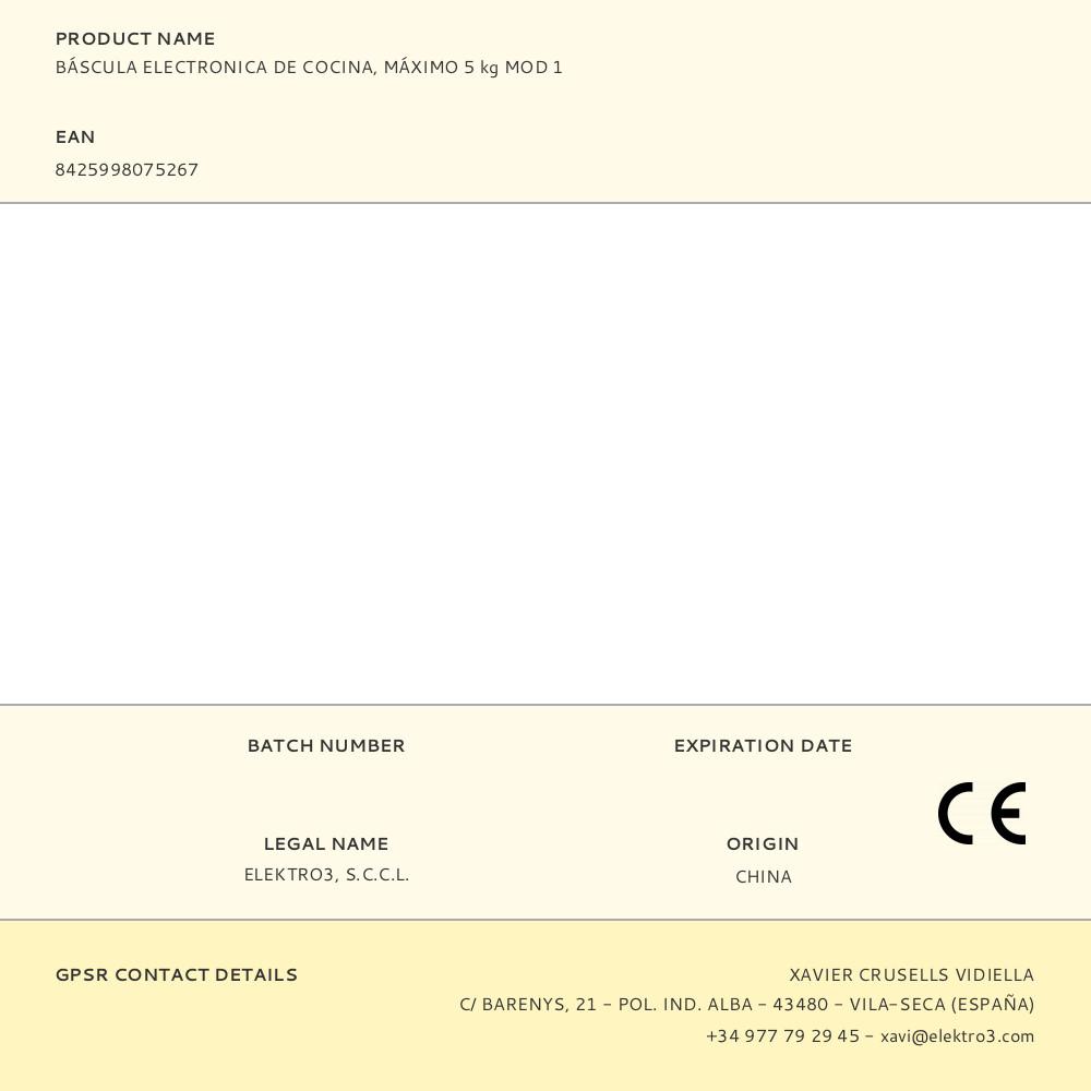 BÁSCULA ELECTRONICA DE COCINA, MÁXIMO 5 kg MOD 1 | Repuesto de calidad, compatible y fácil de instalar
