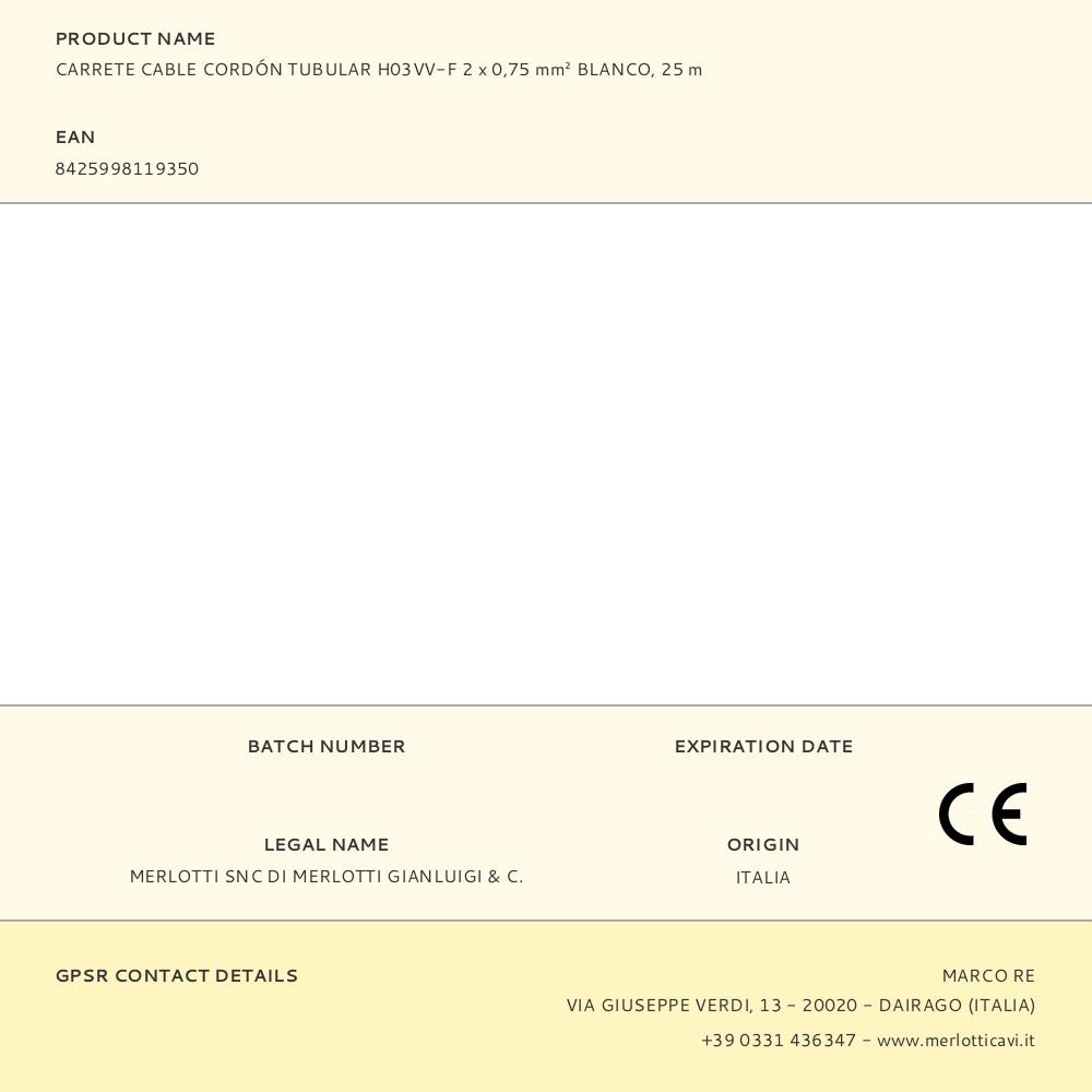 CARRETE CABLE CORDÓN TUBULAR H03VV-F 2 x 0,75 mm² BLANCO, 25 m | Repuesto de calidad, compatible y fácil de instalar