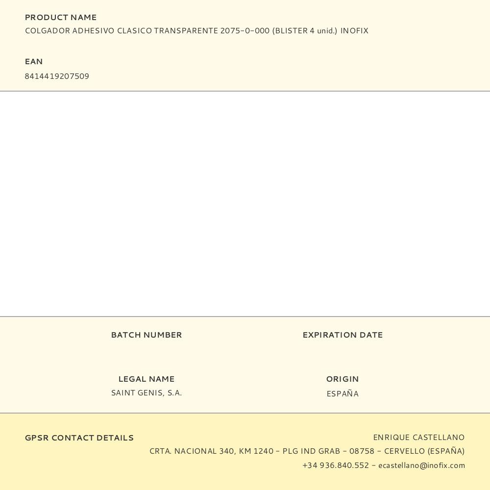 COLGADOR ADHESIVO CLASICO TRANSPARENTE 2075-0-000 (BLISTER 4 unid.) INOFIX | Repuesto de calidad, compatible y fácil de instalar