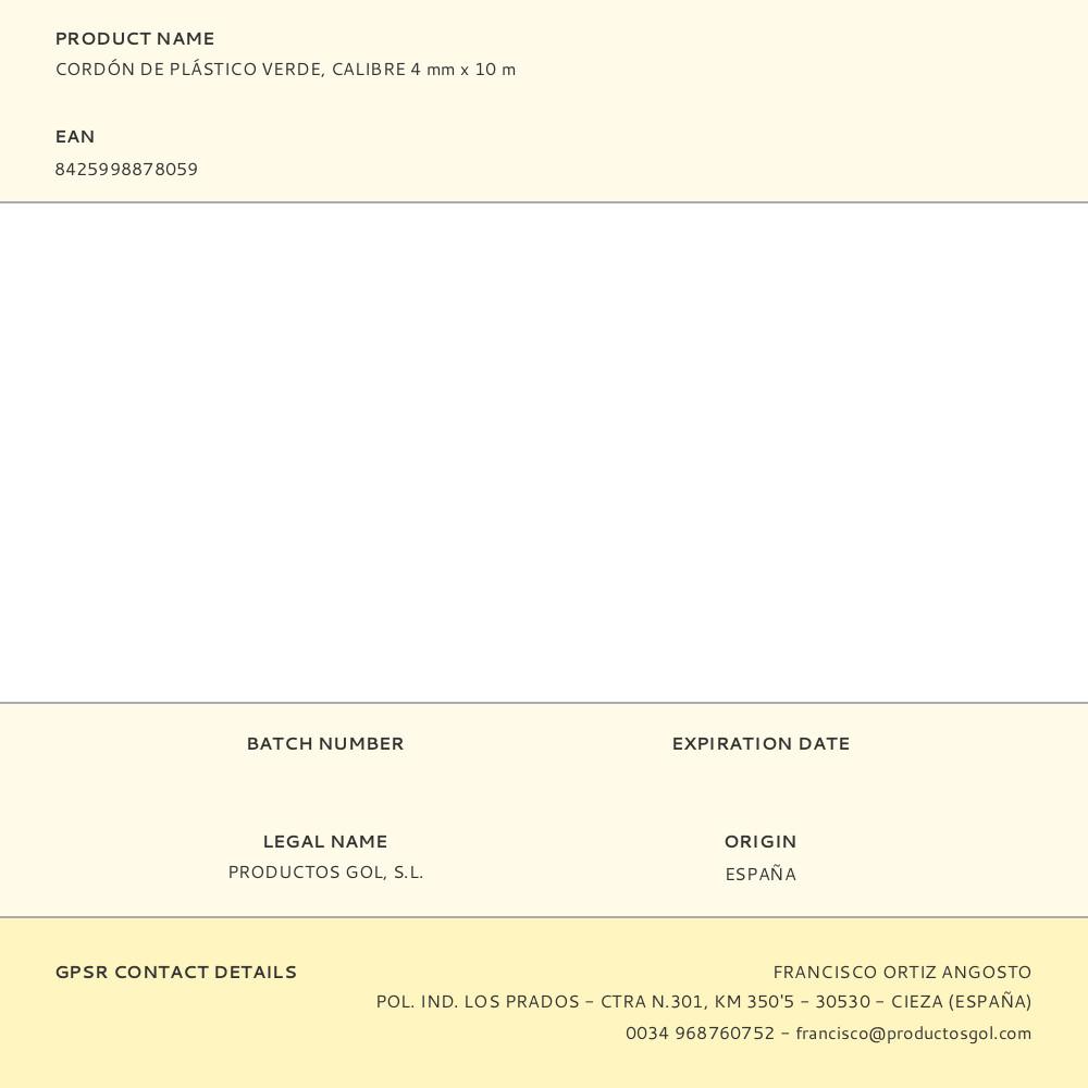 Sé el primero en valorar “CORDÓN DE PLÁSTICO VERDE, CALIBRE 4 mm x 10 m”