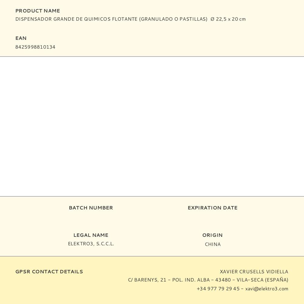 DISPENSADOR GRANDE DE QUIMICOS FLOTANTE (GRANULADO O PASTILLAS) GRANDE. MEDIDA: Ø 22,5 x 20 cm MATERIAL: POLIPROPILENO.. Repuesto original de alta calidad, ideal para sustitución y mantenimiento. Compatible con instalaciones domésticas y profesionales. Producto duradero, fácil de instalar y optimizado para un rendimiento seguro.