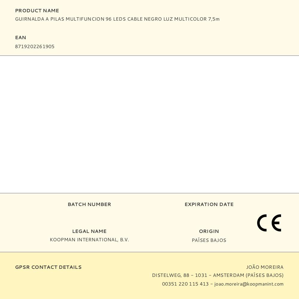 GUIRNALDA A PILAS MULTIFUNCION 96 LEDS CABLE NEGRO LUZ MULTICOLOR PILAS 3xAA NO INCLUIDAS IP44 7,5cm ENTRE BOMBILLAS LEDS 5m PROGRAMADOR 8 FUNCIONES CON MEMORIA + TEMPORIZADOR 6h ENCENDIDO 18h APAGADO CABLE ALIMENTACIÓN 50cm. DISTANCIA ENTRE LA PRIMERA BOMBILLA Y LA ULTIMA 7m. LARGO TOTAL: 7,50m.. Repuesto original de alta calidad, ideal para sustitución y mantenimiento. Compatible con instalaciones domésticas y profesionales. Producto duradero, fácil de instalar y optimizado para un rendimiento seguro.