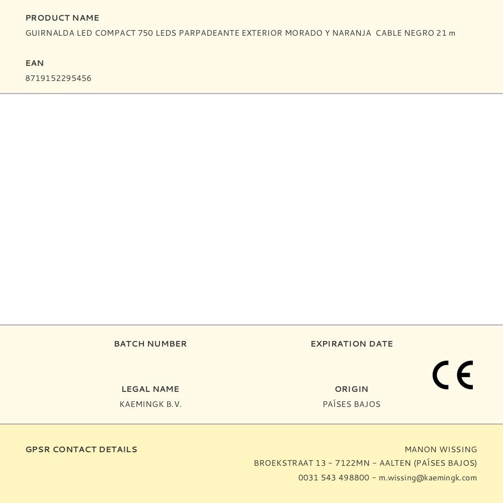GUIRNALDA LED COMPACT PARPADEANTE EXTERIOR MORADO Y NARANJA CABLE NEGRO, TEMPORIZADOR 8h. 8 FUNCIONES. IP44 750 LEDS CABLE ALIMENTACIÓN 5m. DISTANCIA ENTRE LA PRIMERA BOMBILLA Y LA ULTIMA 16m. LARGO TOTAL: 21m.. Repuesto original de alta calidad, ideal para sustitución y mantenimiento. Compatible con instalaciones domésticas y profesionales. Producto duradero, fácil de instalar y optimizado para un rendimiento seguro.