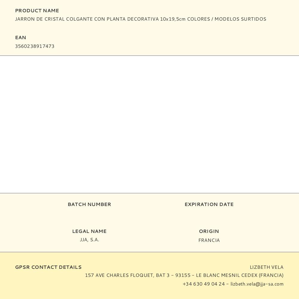 JARRÓN COLGANTE DE CRISTAL CON PLANTA DECORATIVA 10 x 19,5 cm COLORES / MODELOS SURTIDOS. Repuesto original de alta calidad, ideal para sustitución y mantenimiento. Compatible con instalaciones domésticas y profesionales. Producto duradero, fácil de instalar y optimizado para un rendimiento seguro.