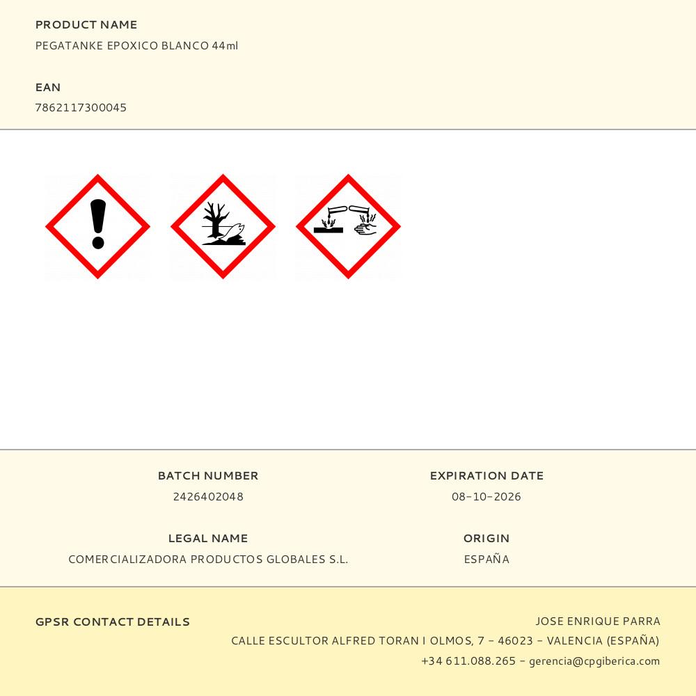 PEGATANKE EPOXICO BLANCO 44ml PEGAMENTO EPOXICO BICOMPONENTE PARA CUALQUIER MATERIAL, COLOR BLANCO, ALTA RESISTENCIA, PEGA BAJO EL AGUA, KIT 44g. DATOS TECNICOS: PEGAMENTO EPOXICO BICOMPONENTE DE COLOR BLANCO, PEGA CUALQUIER TIPO DE MATERIAL, PRESENTA UNA RESISTENCIA A 200kg DE PESO, 250ºC, CON UN TIEMPO DE CURADO DE 30 MINUTOS AL SOL O 90 MINUTOS EN SOMBRA, PEGA BAJO EL AGUA EN UN TIEMPO DE CURADO TOTAL DE 150 MINUTOS, PUEDE SER MECANIZADO, LIJADO, PINTADO Y MANTIENE SU ESTRUCTURA SUMERGIDO EN AGUA, ACEITE O GASOLINA APTO PARA FIBRA DE POLIETILENO. APTO PARA GRANITO