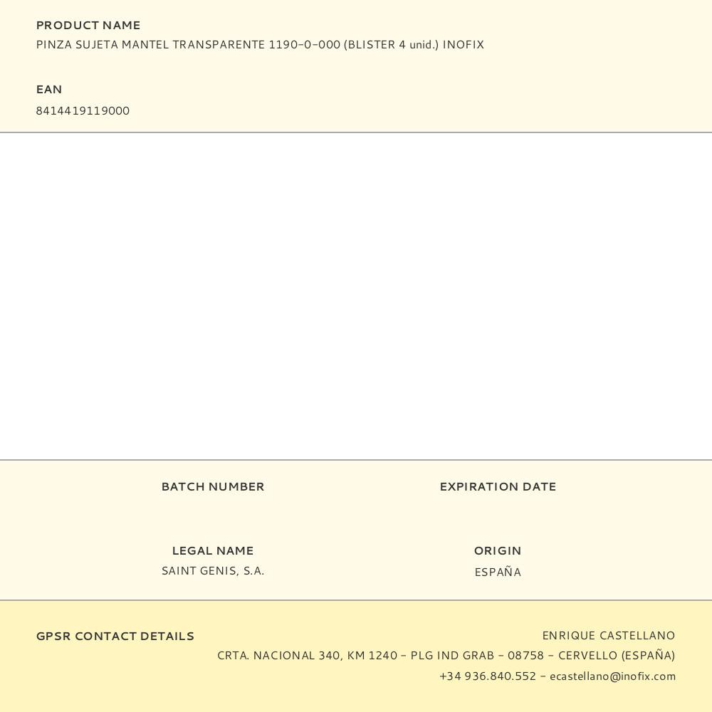 PINZA SUJETA MANTEL TRANSPARENTE 1190-0-000 (BLISTER 4 unid.) INOFIX