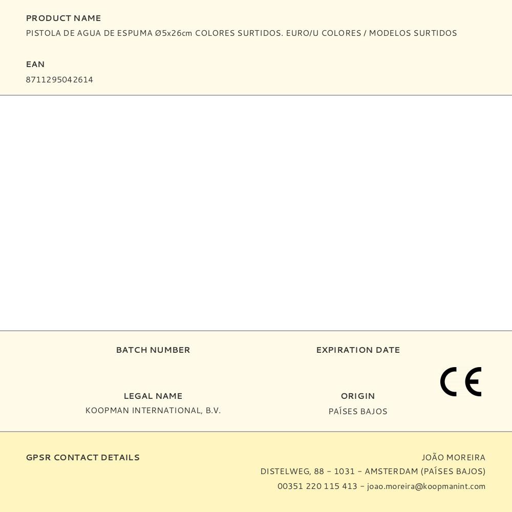PISTOLA DE AGUA DE ESPUMA Ø5x26cm COLORES SURTIDOS. EURO/U COLORES / MODELOS SURTIDOS | Repuesto de calidad, compatible y fácil de instalar