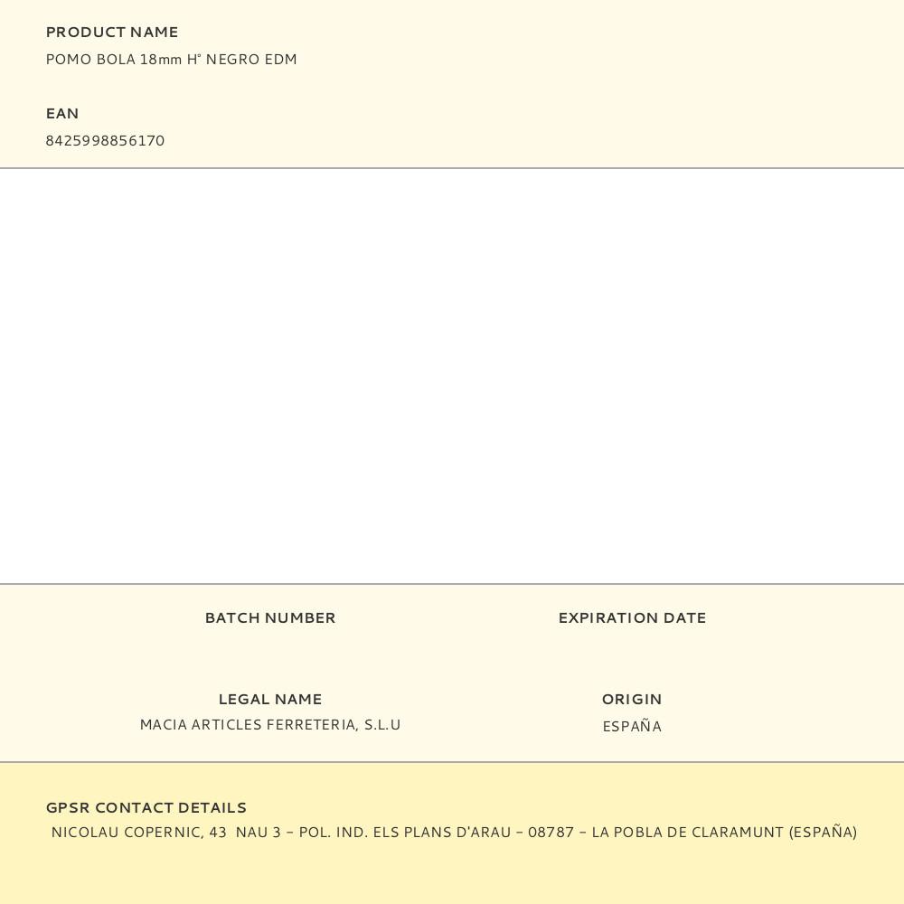 POMO BOLA 18mm H° NEGRO EDM. Repuesto original de alta calidad, ideal para sustitución y mantenimiento. Compatible con instalaciones domésticas y profesionales. Producto duradero, fácil de instalar y optimizado para un rendimiento seguro.