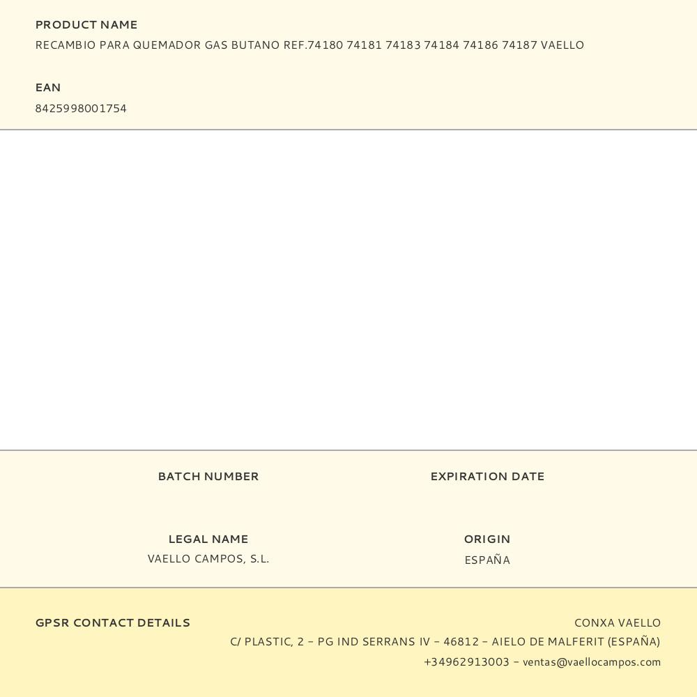 RECAMBIO PARA QUEMADOR GAS BUTANO REF.74180 74181 74183 74184 74186 74187 VAELLO | Repuesto de calidad, compatible y fácil de instalar