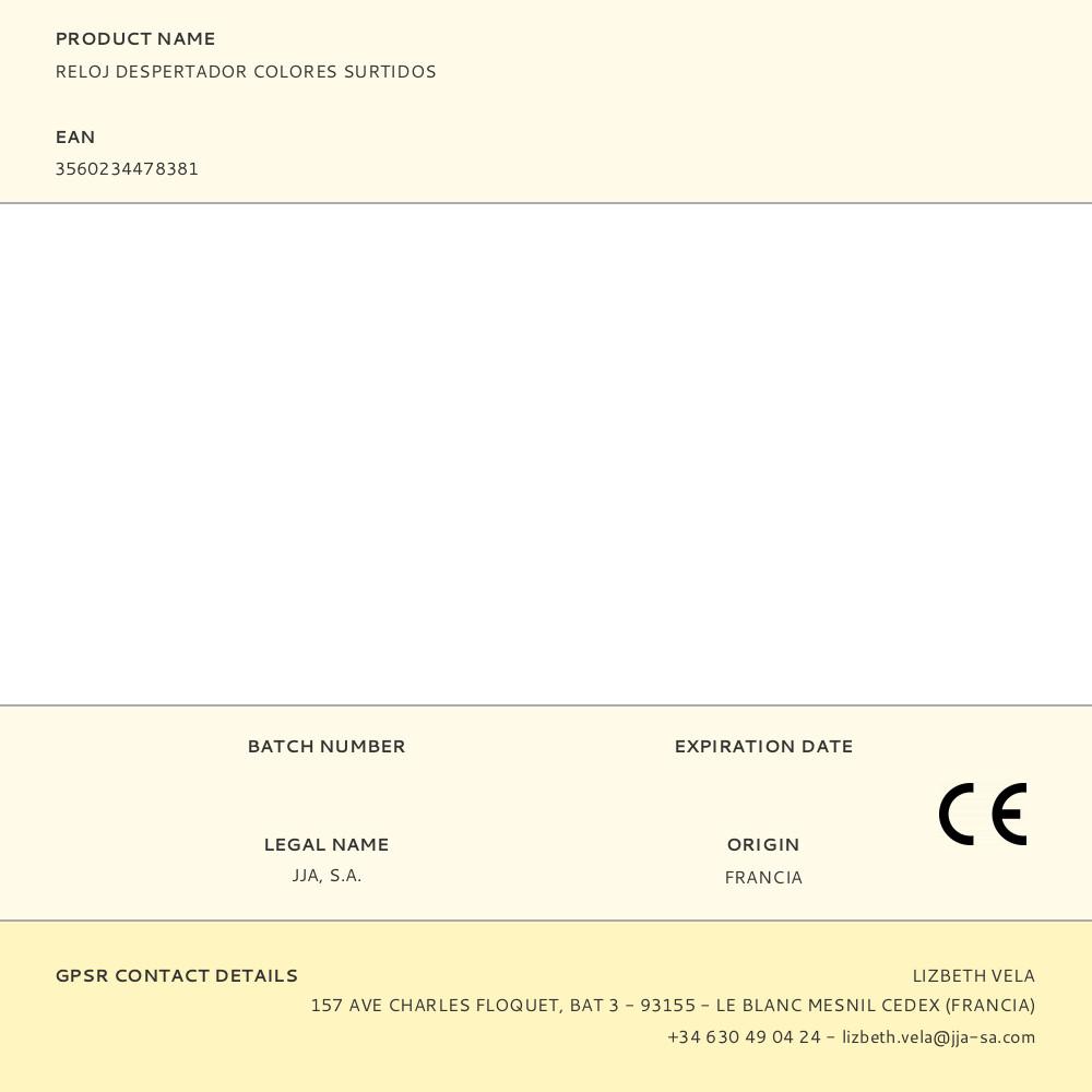 RELOJ DESPERTADOR COLORES SURTIDOS. Repuesto original de alta calidad, ideal para sustitución y mantenimiento. Compatible con instalaciones domésticas y profesionales. Producto duradero, fácil de instalar y optimizado para un rendimiento seguro.