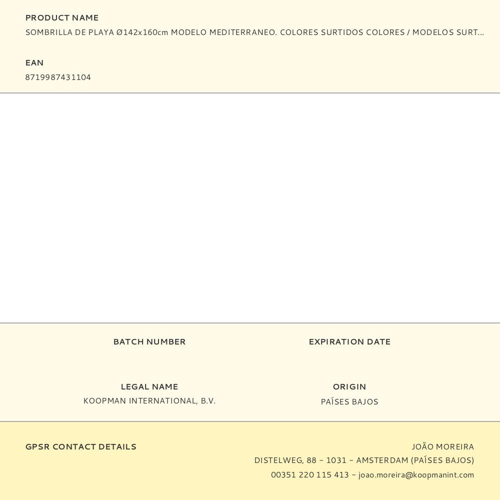 SOMBRILLA DE PLAYA. MODELO MEDITERRANEO. MEDIDA: Ø142x160cm (diámetro/alto) COLORES SURTIDOS. FUNDA NO INCLUIDA. COLORES / MODELOS SURTIDOS. Repuesto original de alta calidad, ideal para sustitución y mantenimiento. Compatible con instalaciones domésticas y profesionales. Producto duradero, fácil de instalar y optimizado para un rendimiento seguro.