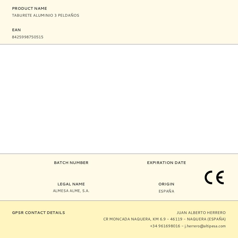 TABURETE ALUMINIO 3 PELDAÑOS SEGUN UNE EN 14183. MEDIDAS PLEGADA 39,5x14x82cm. ALTURA DEL ÚLTIMO PELDAÑO 0,66cm. PESO DEL TABURETE: 2,4kg PESO MAXIMO: 150kg. Repuesto original de alta calidad, ideal para sustitución y mantenimiento. Compatible con instalaciones domésticas y profesionales. Producto duradero, fácil de instalar y optimizado para un rendimiento seguro.