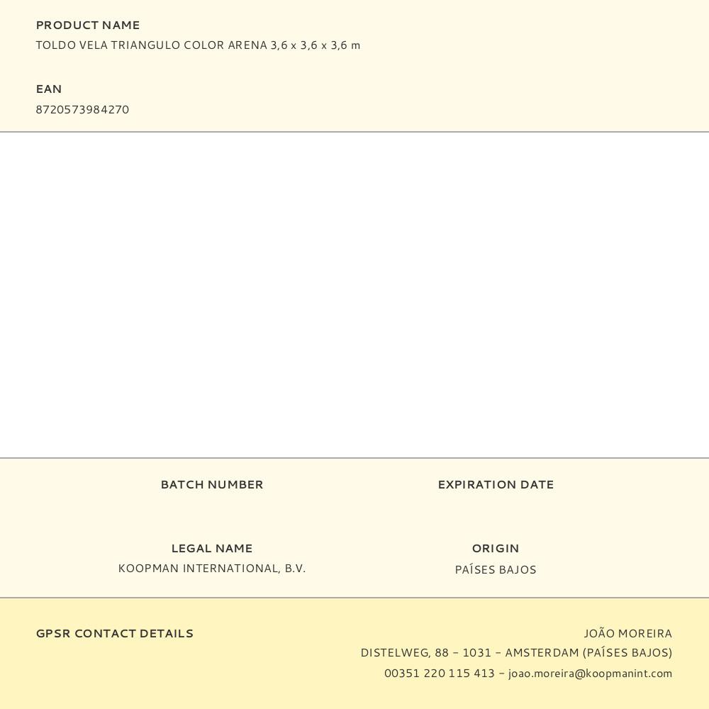 TOLDO VELA TRIÁNGULO COLOR ARENA, 3,60 x 3,60 x 3,60 m, 170 g/m², RESISTENTE AL AGUA, UPF CLASIFICACIÓN 50+, ANILLAS DE METAL, 3 CORDONES DE 2,3 m, BOLSA CON CREMALLERA. Repuesto original de alta calidad, ideal para sustitución y mantenimiento. Compatible con instalaciones domésticas y profesionales. Producto duradero, fácil de instalar y optimizado para un rendimiento seguro.