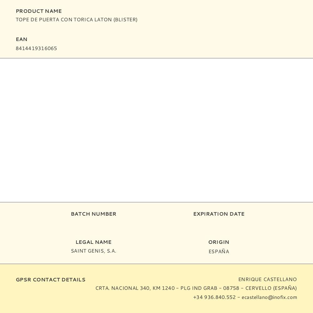 TOPE DE PUERTA CON TORICA LATON (BLISTER) INOFIX. Repuesto original de alta calidad, ideal para sustitución y mantenimiento. Compatible con instalaciones domésticas y profesionales. Producto duradero, fácil de instalar y optimizado para un rendimiento seguro.